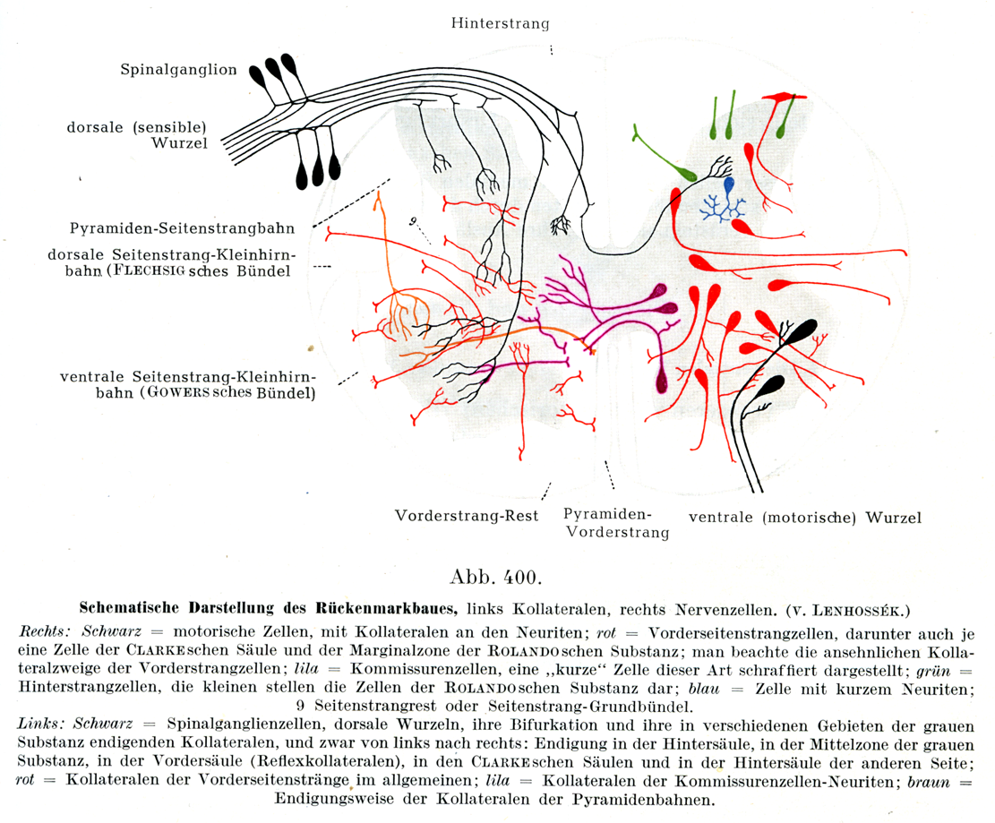 右側:黒は運動性細胞で,その神経突起に側枝がある;赤は前側索に線維を出す索細胞,その中にはまたクラーク柱の細胞およびローランド膠様質の辺縁帯の細胞もそれぞれ1つずつ含まれている;前索細胞の側枝がよく発達していることに注意せより紫は交連細胞,この種に属する「短い」突起をもつ細胞の1つを斜線で示してある; 緑は後索細胞,小さい細胞はローランド膠様質の細胞である;青は短い神経突起を有つ細胞;9 側索基礎束.左側:黒は脊髄神経節の細胞,後根,その分岐部および灰白質のいろいろな領域に終る側枝,しかも左から右へ次の順序になっている:後柱における終末,灰白質の中間部における終末,前柱における終末(反射側枝Reflexkollateralen), クラーク柱および他側の後柱における終末;赤は前側索の側枝として総括されうるもの;紫は交連細胞の神経突起の側枝;褐は錐体路の側枝の終る様子.