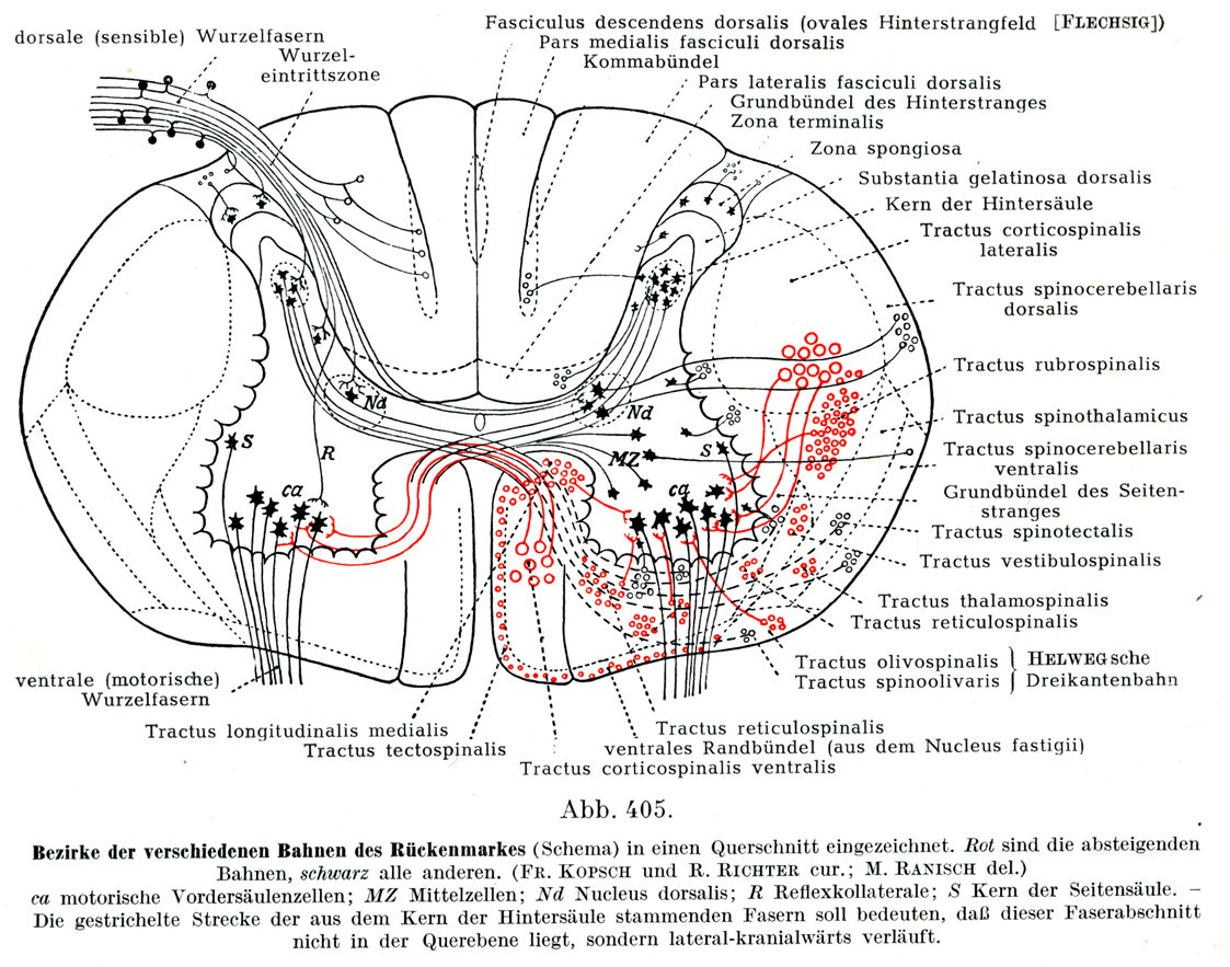 [図405]脊髄における種々の伝導路の領峨を示す(模型図).1つの断面にまとめて書きこんである.赤は下行性の伝導路,黒はその他のもの全部.