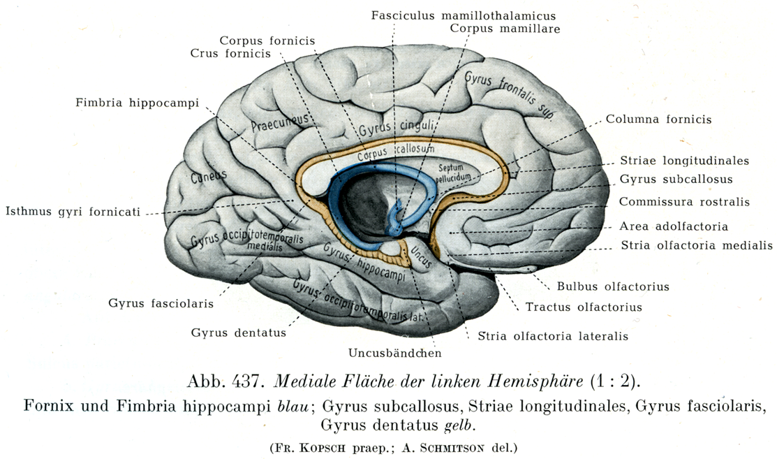[図437]左大脳半球の内側面.(1/2) 脳弓および海馬采は青,梁下回・内外の両縦条・小帯回・歯状回は黄で示す.(引取線の説明のうちUncusbändchenは鈎小帯を意味し,後述のジアコミニ縁帯と同じものである.(小川鼎三))