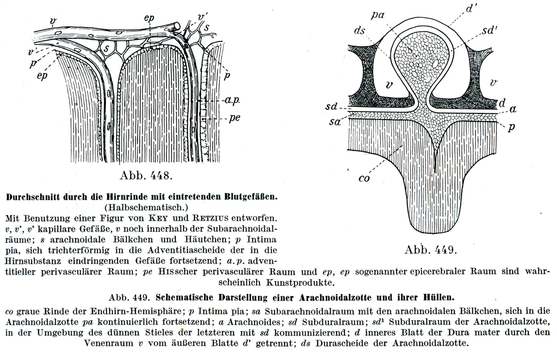 KeyとRetziusの図にもとづいて画いてある.v, v', v'毛細血管,vまだクモ膜下腔の内部にあるもの;5 クモ膜小梁と小膜;P 柔膜の内膜Intima pia,これは脳内に進入する血管の外膜鞘にロート状をなして続いている;a. p. 外膜性の血管周囲腔;Pe ヒス血管周囲腔Hisscher Perivasculdirer Raum と ep, ep いわゆるepicerebraler Raum(脳表面腔)とはおそらく人工産物であろう.