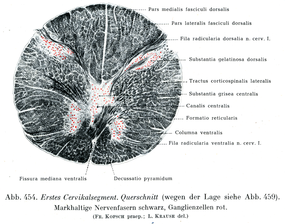 (その高さについては図459を参照). 有髄神経線維は黒,神経細胞は赤.