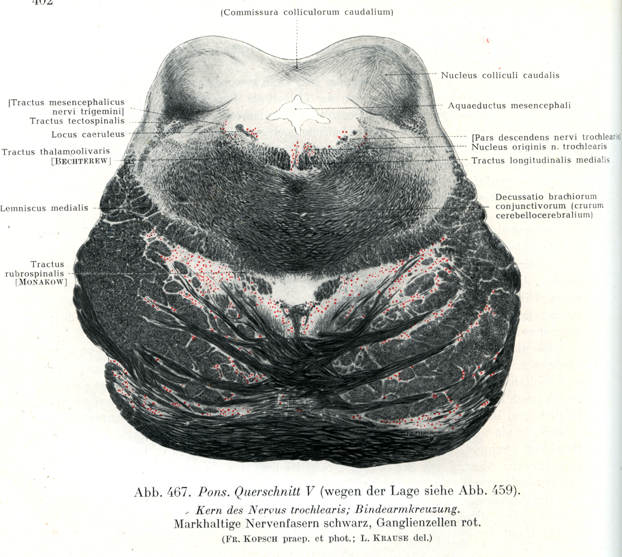 滑車神経の核,結合腕交叉がみえる. 有髄神経線維は黒,神経細胞は赤.