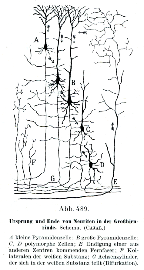 A 小錐体細胞;B 大錐体細胞;C, D多形細胞;E 他の中枢部から出てきた線維の終末;F 白質の側枝;G 白質のなかで枝分れする軸索(軸索の2分).