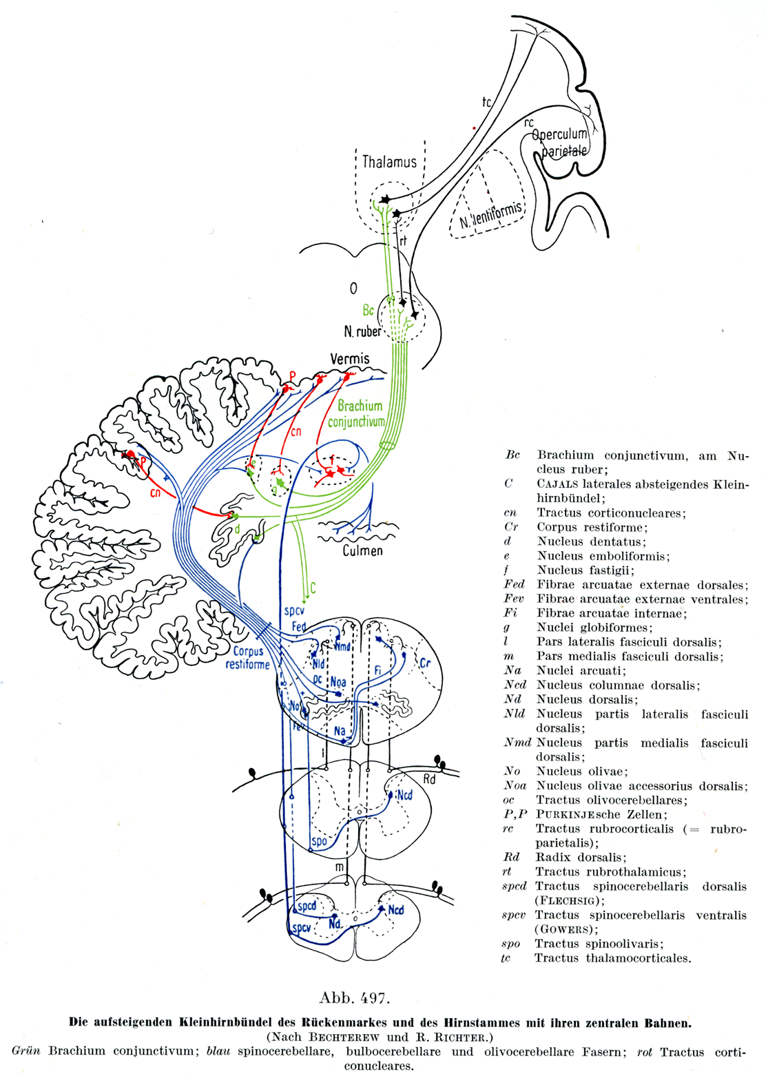 [図497]脊髄と脳幹から小脳へ上行する線維束およびそれらの中心経路(BechterewおよびR. Richterによる)