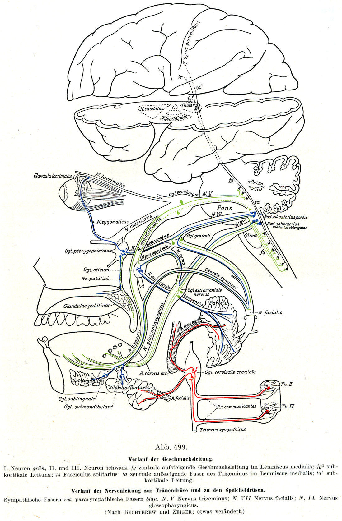 涙腺と唾液腺への神経伝導の経路 交感神経線維は赤,副交感神経線維は青.N. V 三叉神経;N. VII 顔面神経;N. IX 舌咽神経.(Bechterew および Zeigerによる;いくぶん変更してある)