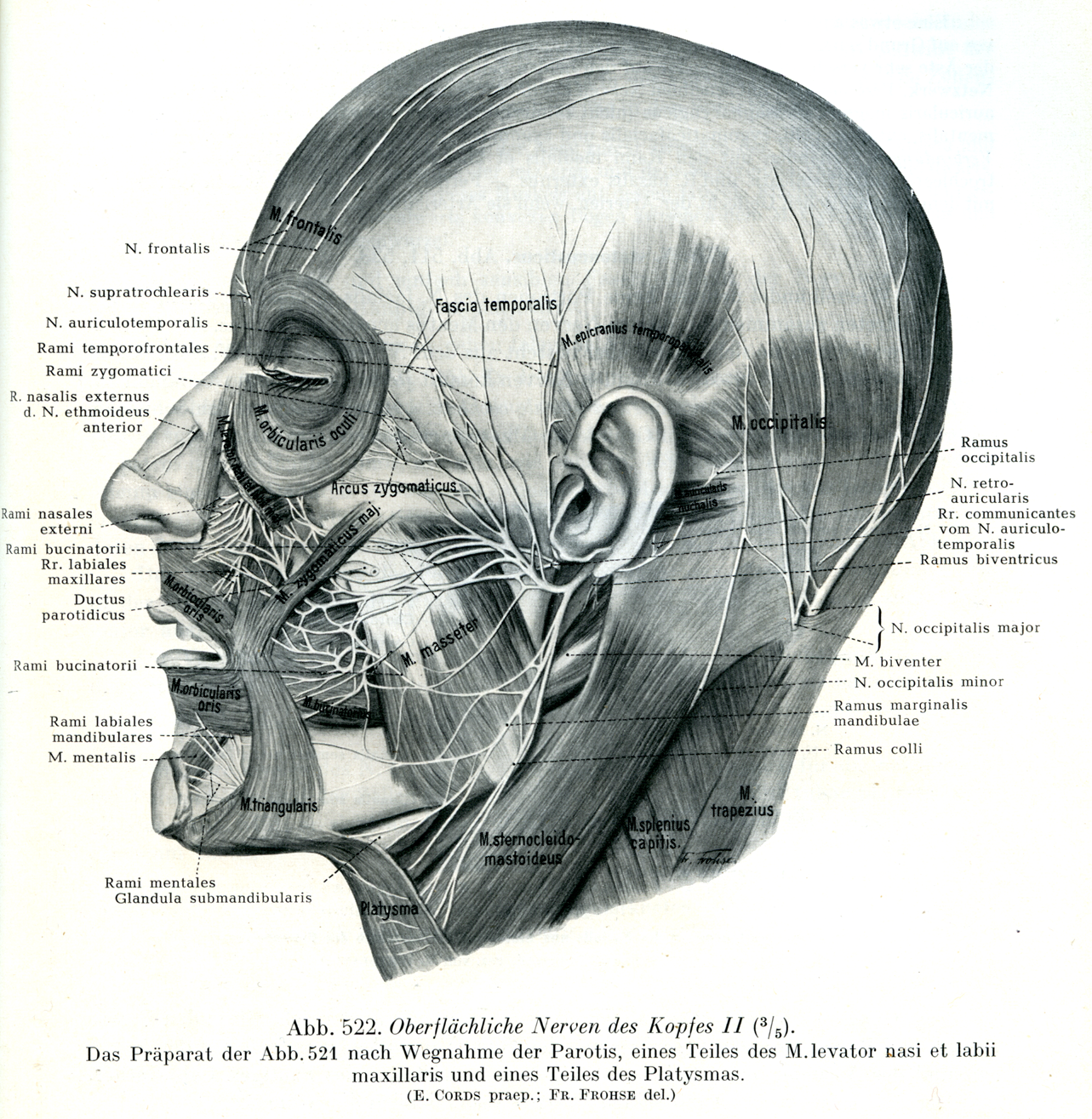 図521の標本の耳下腺を取り去り,眼角筋の一部と広頚筋の一部とを取り除いてある.
