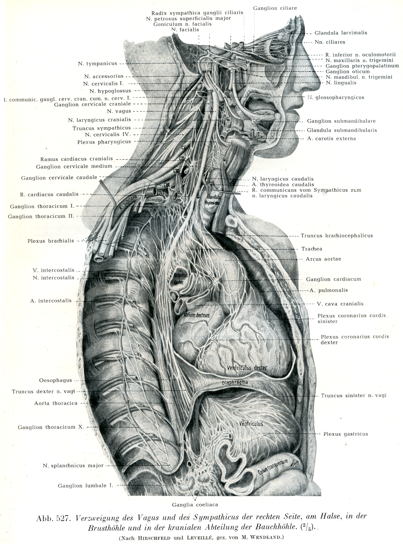 右側の迷走神経と交感神経の頚部,胸腔および腹腔の上部における分枝