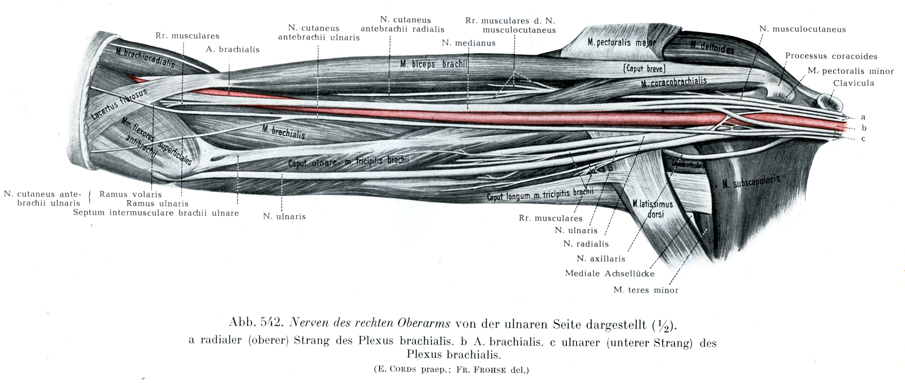 a 腕神経叢の(上方の)橈側神経束.b 上腕動脈.c 腕神経叢の(下方の)尺側神経束.