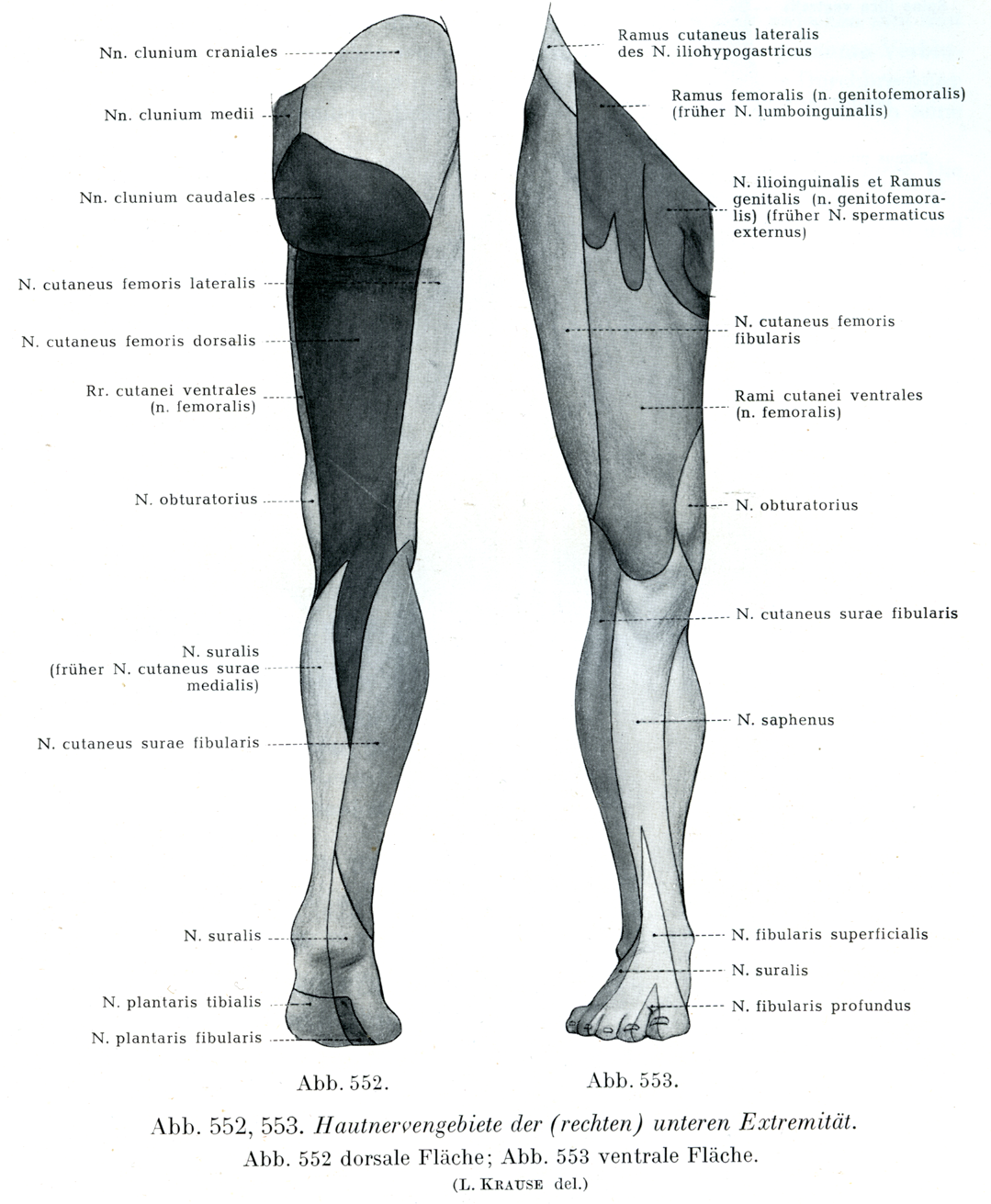 図552 後面;図553 前面.(日本人の下肢の皮神経分布については,左右各10肢を用いた牛尾の詳細だ報告がある.(牛尾甦生平:邦人下肢の皮神経分布に就て.解剖学雑誌,7巻,757~871,1934))