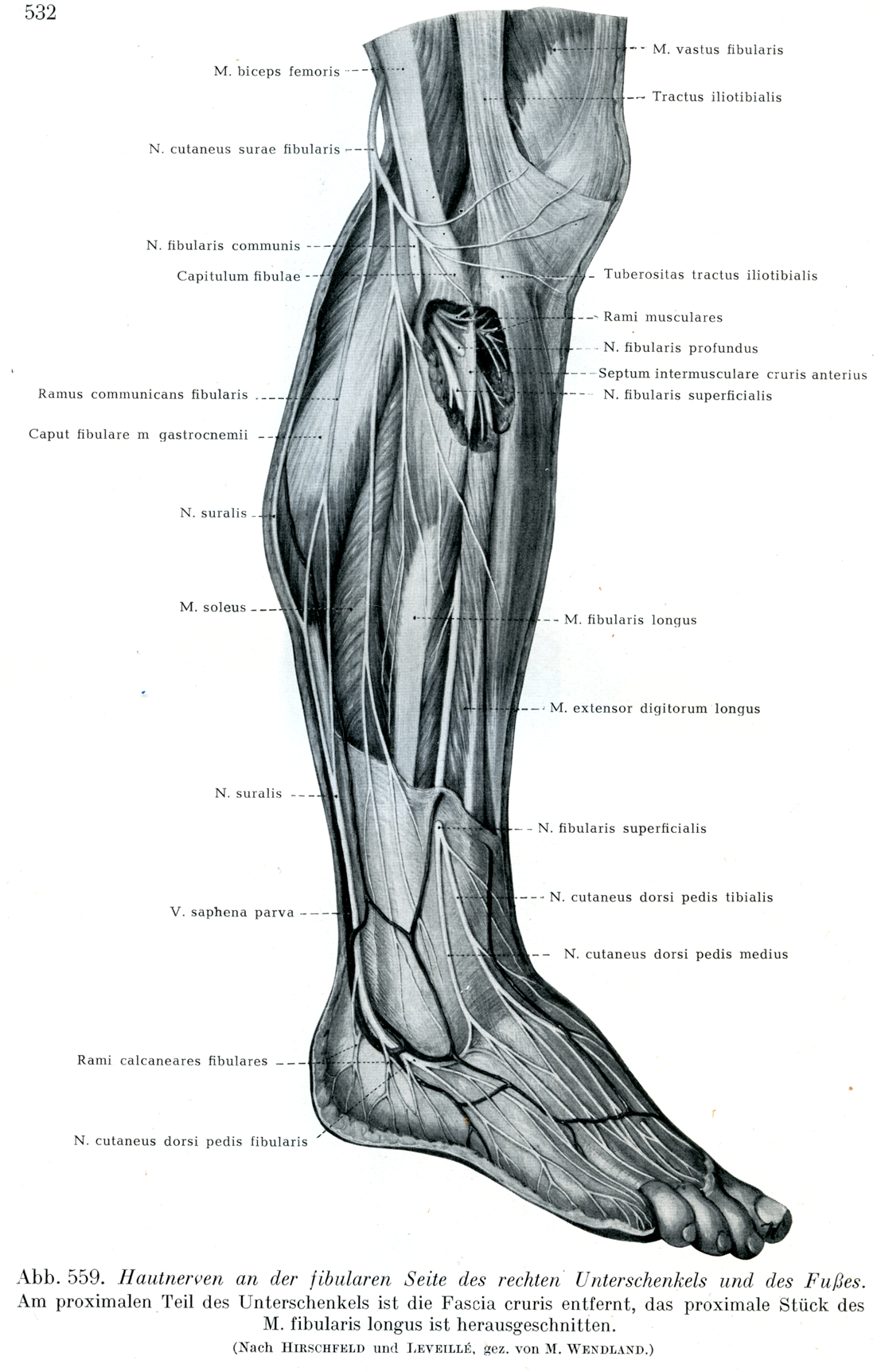 下腿の上部では下腿筋膜を取りさり,長腓骨筋の上部を切りとってある.(Hirschfeld)およびLeveilléによる)