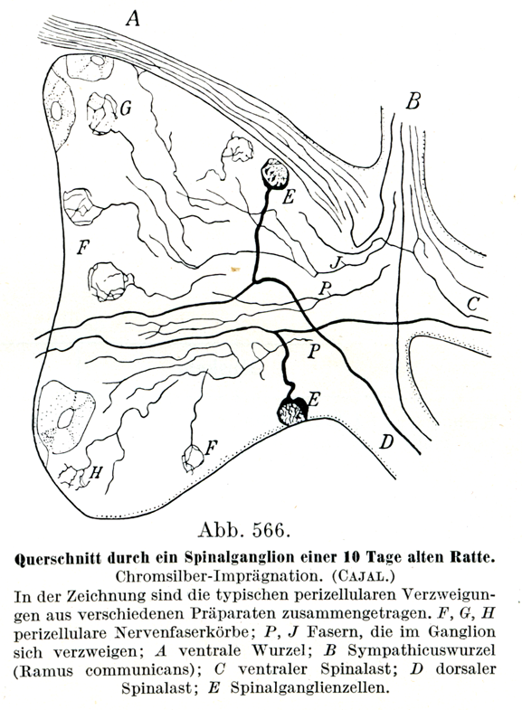 F, G, H細胞周囲の神経線維籠Nervenfaserkörbe;P, J 神経節のなかで枝分 れする線維;A前根;B交感神経根(交通枝);C 脊髄神経の前枝;D 脊髄神経の後枝;E 脊髄神経節の細胞.