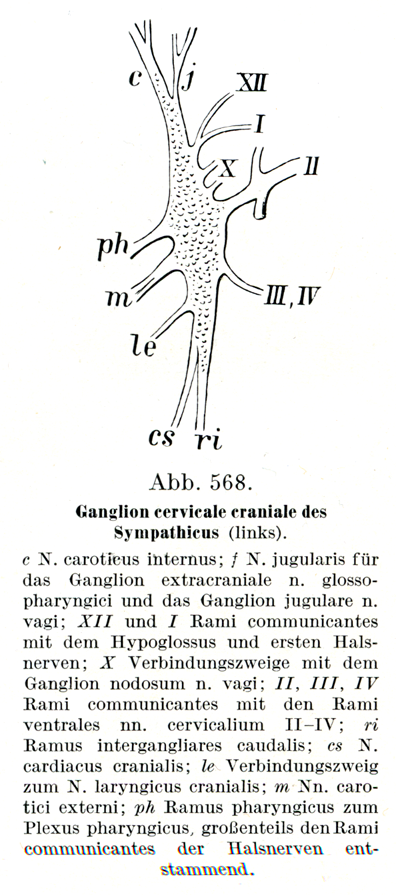 c 内頚動脈神経;j 舌咽神経の外神経節と迷走神経の頚静脈神経節への頚静脈神経;XII および1 舌下神経および第1頚神経との交通枝;X 迷走神経の節状神経節との結合枝;11, III,1V 第2~第4頚神経の前枝との交通枝;ri 下方への節間枝;CS上心臓神経;le 上喉頭神経にいたる結合枝;m 外頚動脈神経;pg 咽頭神経叢にいたる咽頭枝,その大部分は頚神経の交通枝に由来する.