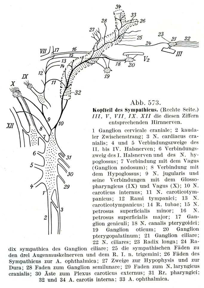 1 上頚神経節;2 下方の節間枝;3 上心臓神経;4および5 第2から第4までの頚神経との結合枝;6 第1頚神経および舌下神経と上頚神経節とを結合する枝;7 迷走神経(節状神経節)との結合;8 舌下神経との結合;9 頚静脈神経,それが舌咽神経(IX)および迷走神経(X)と結合することを示す;10内頚動脈神経;11頚鼓神経;12 鼓室枝;13 頚鼓神経;14 耳管枝;15 小浅錐体神経;16大浅錐体神経;17 膝神経節;18 翼突管神経;19 耳神経節;20 翼口蓋神経節;21 毛様体神経節;22 毛様体神経;23毛様体神経節の長根;24 毛様体神経節の交感根;25 3つの眼筋神経と三叉神経の第1枝(眼神経)とにいたる交感神経の小枝;26 眼動脈への交感神経の小枝;27下垂体と硬膜へいたる枝;28半月神経節への枝;29上喉頭神経への枝;30外頚動脈神経叢への枝;31咽頭枝;32および34 内頚動脈;33 眼動脈.