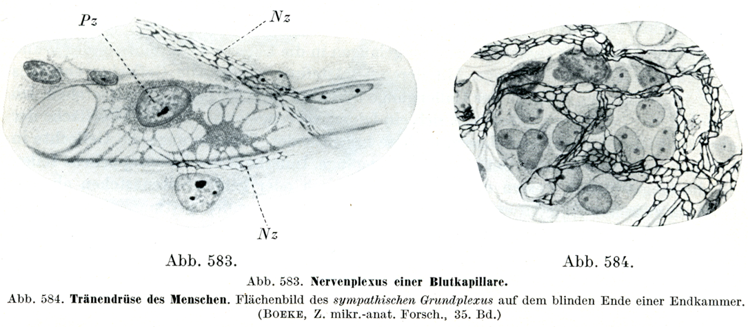[図584]ヒトの涙腺 終末部の行きづまりの端で 交感神経性の基礎叢を平面的にみたもの(Boeke, Z. mikr.-anat. Forsch., 35. Bd. )