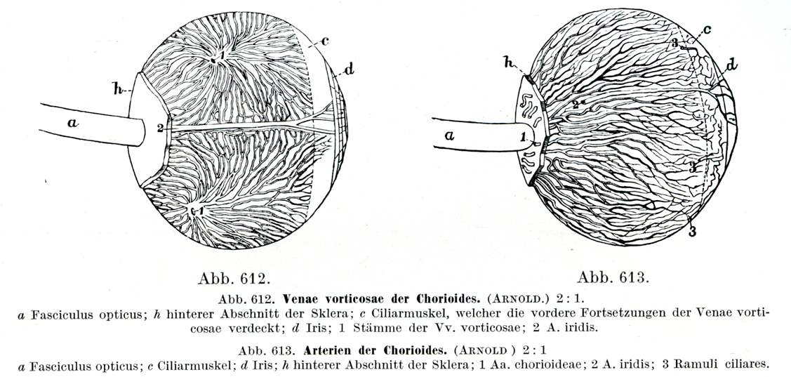 a 視神経,c 毛様体筋,d 虹彩, h 強膜の後部,1脈絡膜動脈,2 虹彩動脈,3 毛様体小枝