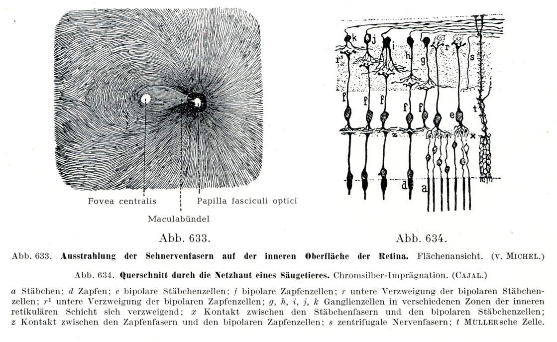 a 杆状体, d 錐状体, e 杆状体と連絡する双極性細胞,f錐状体に連絡する双極性細胞,r 杆状体に連絡する双趣性細胞の内方突起の分枝, r2 同じく錐状体に連絡するものの分枝. 9, h, i, j, k 神経細胞の突起が内網状層のいろいろな深さのところで分枝している.x 杆状体線維とこれに連絡する双極性細胞との接触, Z 錐状体線維と双極性細胞との接触, s 遠心性神経線維,t ミュレル細胞(放線線維)
