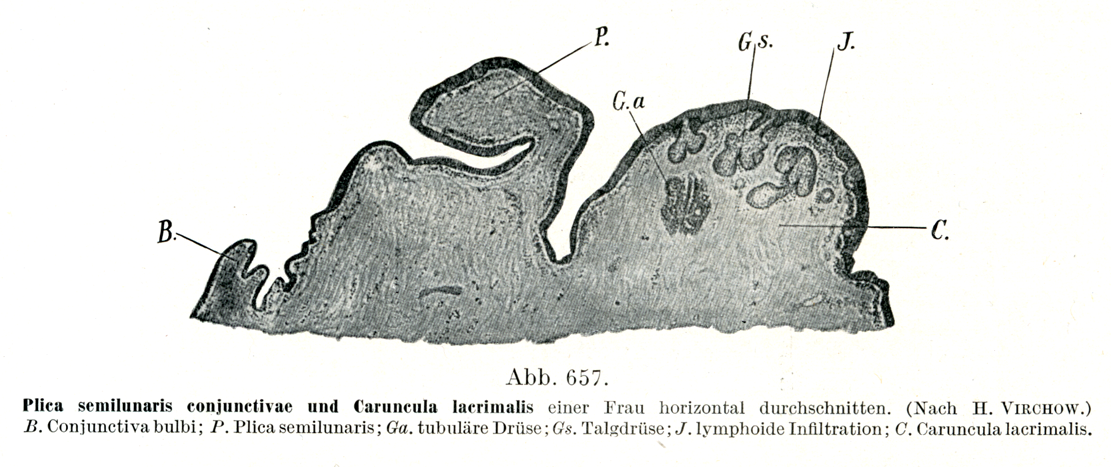 [図657]結膜半月ヒダと涙丘 1婦人のものを水平断 (H. Virchowによる)