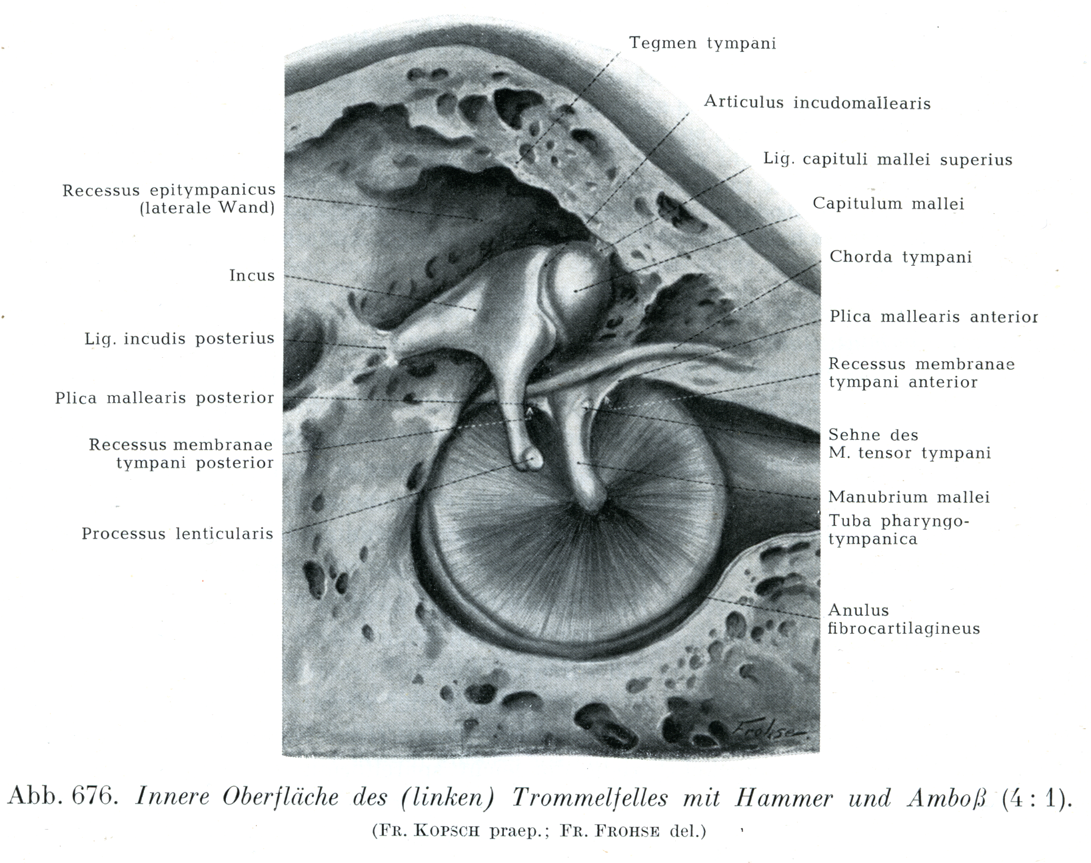 左の鼓膜の内面とツチ骨およびキヌタ骨