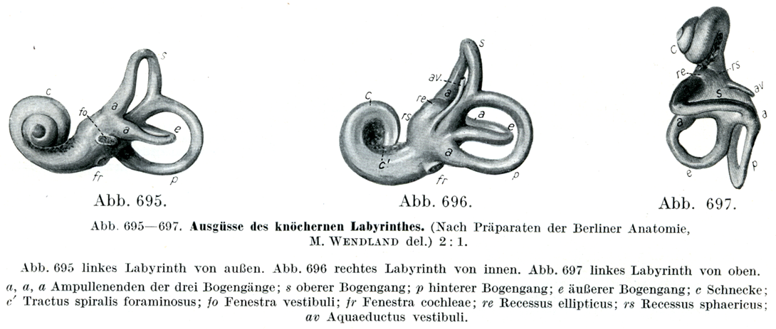 図695は左の迷路を外方から,図696は右の迷路を内方から,図697は左の迷路を上方からみる.a, a, a 半規管の膨大部;s 上半規管,p 後半規管,e 外側半規管,c 蝸牛,c' ラセン孔列,fo 前庭窓,fr 蝸牛窓,re 卵形嚢陥凹,rs 球形嚢陥凹,av 前庭小管.