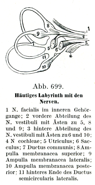 1 内耳道内の顔面神経,2 前庭神経の前方部,その枝が5,8および9に分布しているところ.3 前庭神経の後部,その枝が6と10に分布する.4 蝸牛神経,5 卵形嚢,6 球形嚢,7 総管,8 上(前)膜膨大部,9 外側膜膨大部,10 後膜膨大部,11 外側半規管の後端.