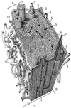 海綿質;海綿骨;小柱骨【かいめんしつ;かいめんしつ;しょうちゅうしつ】 Loosely organized bone substance with interstices filled with bone marrow.(骨の内部の大部分は細い骨梁からなる海綿質でできている。海綿質は、三次元的な有孔の網目格子に配列している骨で外力の影響を受けて、適切な数の骨梁が形成されており、骨の強度を生み出している。骨の内腔は「曲げ」に対する抵抗力にはあまり貢献していない。しかし内腔があるおかげで骨の重量は著しく軽減されており、われわれの骨格の重要は平均してわずか7kgに過ぎない。内腔の骨梁間の腔所(骨髄腔)は、骨髄がつまっている重要な場所である。)