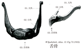 小角(舌骨の)【しょうかく(ぜつこつの)】 Small horn on the hyoid bone.(舌骨の小角は短小の錐体状で、舌骨体と大角との結合部から後上方に出で、小角の尖端は茎突舌骨靱帯によって側頭骨上の茎状突起と連結する。)