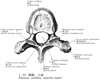 椎弓根【ついきゅうこん】 The part of the vertebral arch located on the vertebral body between the superior and inferior vertebral notches.(椎弓根は椎体に付く椎弓の前部。上縁と下縁にある上椎切痕と下椎切痕により、上下から狭められる。多くの椎骨では椎弓板は椎弓根より深く、したがって椎弓根は椎体後面の上端寄りに着くようにみえる。)