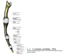 中手骨[1-5]【ちゅうしゅこつ[1-5]】 Metacarpal bones of the hand.(中手骨は手根骨の遠位にある5本の細長い管状骨である。第1中手骨が最も短いが、最も太い。最も長いのは第2中手骨で、ついで第3、第4、第5中手骨の順に短い。中手骨には頭・底・体の3部が区別できるが底は中手骨の近位端で太く、手根骨との関節面をもっている。関節面の形は中手骨によって異なり、第1中手骨は鞍状に凸、第2中手骨では中央にくぼみがみられ、第3、第4中手骨では平らである。第5中手骨では不完全な鞍状を呈する。体は後面に向かってゆるく弯曲していて底および頭より細いので、となりあう中手骨の間に中手骨間隙ができる。頭はまるく大きく、基節骨底に接する関節面がある。第3中手骨底の背面外側には小さな突起がみられ、第3中手骨の茎状突起という。)