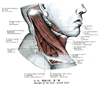 後斜角筋【こうしゃかくきん】 o:Transverse processes of C4-C6. i: Upper margin of second rib. Elevation of the rib. Lateral flexion of the neck. I: Brachial plexus (C7 C8).(後斜角筋は、C5とC6の横突起後結節から起こり、筋腹は中斜角筋の背側縁を廻って腹側に向きを変え、第2肋骨外面に、ときどきさらに第3肋骨に停止する。神経支配はC7およびC8由来の頚神経叢からの筋枝を受ける。参考:斜角筋群は主に吸息筋として働き頚椎を動かす作用はむしろ従であるという。)