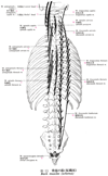 胸最長筋【きょうさいちょうきん】 o: Sacrum, spinous processes of lumbar vertebrae, transverse processes of lower thoracic vertebrae, i: Medially on the transverse processes of the lumbar and thoracic vertebrae; laterally on the costal process of the lumbar vertebrae, ribs, and anterior layer of thoracolumbar fascia.(胸最長筋は腰部腸肋筋と一緒に強大な腱板でもって腰椎棘突起、仙骨、腸骨後縁、後仙腸靱帯から起始する。いわゆる副突起は下位6個の胸椎横突起と上位2個の腰椎の乳頭突起に由来する。胸部では内側への停止は全胸椎の横突起であり、外側への停止は第2~12肋骨の助骨角の内側である。脊柱腰部では、筋束は上記相同の部分へ、内側の筋束は第1~4腰椎の副突起(L5の乳頭突起と同じように)へ、そして外側の停止は第1~4腰椎肋骨突起(胸腰筋膜の深層と同じように)至る。)