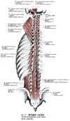 棘間筋;棘突間筋【きょくかんきん;きょくとつかんきん】 Muscles extending between the spinous processes of two adjacent vertebrae. I: Posterior rami of C1-T3 and T11-L5.(棘間筋の起始と停止は腰椎から第2頚椎までの脊椎棘突起をつなぐ短い筋肉束。胸椎には必ずしも存在しない。しばしば頚椎に二重に存在する。機能として頚椎伸展の補助。神経支配は脊髄神経の後枝。動脈は後肋間動脈と腰動脈の筋枝、肋頚動脈の深頚枝から受ける。 棘系の筋線維は棘突起から棘突起へわたり(棘間筋:対で、単節性で、脊柱胸部の中央部で欠損)、少なくとも1つの椎骨を飛び越える(棘筋:C2~L2の間)。)