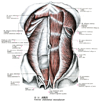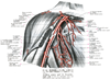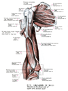 大胸筋【だいきょうきん】 o:Clavicle. Sternum. Second to seventh costal cartilages and rectus sheath, i: Crest of greater tubercle. Adduction and medial rotation of the arm. I: Medial and lateral pectoral nerve.(大胸筋は上肢の屈筋群から派生したもので、前胸壁にある大きな翼状の筋で鎖骨部、胸肋部、腹部からなる。鎖骨部は上肢帯(鎖骨)から腹側胸壁に広がって上腕骨大結節稜(遠位)に停止する。これは鎖骨の胸骨半、胸骨、および第(1)2~7肋軟骨から起こり、腹直筋鞘の前葉からも起こる。胸肋部と腹部の線維は鎖骨部の線維の下を横切り、大結節稜の近位に着き、鎖骨部は遠位に停止する。広背筋の場合のように、頭側に開き、上腕の外転と前方挙上の際に明らかとなる筋肉のスポットが生じる。上腕を垂れ下げているときは、大胸筋は四角形をしているが、上腕骨が外転されると、三角形となる。外側縁は前腋窩ヒダを形成している。後腋窩ヒダは広背筋の外側縁によってつくられている。大胸筋の鎖骨部と三角筋の間の奥には結合組織腔があり、そこを橈側皮静脈が通る。その隙間は力強い、筋肉の発達した人では非常に狭い。しかし、大胸筋の鎖骨部の発達が弱い場合は、鎖骨に向かって広がり、逆さにした三角形に似ている。その場合、鎖骨胸筋三角という名前が適当である。ここでは皮膚が窪んで鎖骨下窩を形成している。種々の形と大きさの胸骨筋が胸筋筋膜の上に発達することがある。これは肋骨縁に沿って一側または両側に広がっている(ヨーロッパ人の約5%)。もしこの筋が胸筋神経の枝で支配されていれば、これは哺乳類の皮筋の遺残と考えることができる。この筋はしばしば胸鎖乳突筋とつながっており、肋間神経の枝で支配されているかもしれない。広背筋の前縁と大胸筋の外側縁との間には、結合組織の線維(線維性腋窩弓fibrous axillary arch)が弓状に走って両筋を結んでいるが、数%の頻度でここに筋線維束(筋性腋窩弓muscular axillary arch)がみられる。筋性腋窩弓の存在は、生体でも皮膚の上から認めることが出来る。この以上筋束を最初に記載したのはRamsay(1795)であるが、Langer(1846)の広汎な研究以来、ランゲル筋Langer's muscleと呼ばれるようになった。)