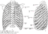 横隔膜【おうかくまく】 Dome-shaped musculofibrous septum dividing thoracic and abdominal cavities. I: Phrenic nerve.(横隔膜は胸腔と腹腔との境を作る膜状筋で、胸郭下口の周りから起こる。この起始部を腰椎部、肋骨部、胸骨部の3部に分ける。これらの部から出る筋束は全体として円蓋のように胸腔に盛り上がって集まり、中央部の腱膜につく。これを腱中心という。横隔膜の上面は胸内筋膜および胸膜と心膜、下面は横隔膜筋膜(横筋筋膜の一部)および腹膜(肝臓その他の臓器が接する部分を除いて)被われる。ドーム状の横隔膜は胸腔の床および腹腔の天井となる。閉鎖した筋腱様のしきりは哺乳類の特質である。横隔膜は最重要な呼吸筋である。筋素材は系統発生的に第3~5の頚部筋節から由来し、頚神経叢からの横隔神経(C4(3,5))に支配される。筋性横隔膜は腰椎部、肋骨部、胸骨部から形成される。)