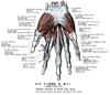 虫様筋[手の]【ちゅうようきん[ての]】 o: Tendons of flexor digitorum profundus. i: Doral aponeuroses of second through fifth fingers. Flexion of metacarpophalangeal joint, extension of interphalangeal joints. I: Ulnar nerve.(第4つの虫様筋は、各々深指屈筋の腱の橈側から起こり、そのため深指屈筋の収縮中緊張する。虫様筋は深横中手靱帯の掌側を遠位に向かい、したがって指の対応する基節関節の屈曲軸の掌側を走る。それらの腱は橈側から指背腱膜に入る。腱停止部の近位線維は基節骨の背側面をほぼ横断するのに対し、遠位線維は中節骨と末節骨の背側面を斜走する。)