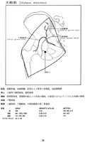 大殿筋;大臀筋【だいでんきん】 o: Ilium, behind the posterior gluteal line, sacrum, coccyx, thoracolumbar fascia, sacrotuberous ligament, i: Fascia lata, iliotibial tract, gluteal tuberosity, lateral femoral intermuscular septum, linea aspera. Extension, lateral rotation, abduction, and adduction at the hip joint. I: Inferior gluteal nerve.(大臀筋は大腿を伸展する主力筋で、とくに歩行の際重要である。中臀筋や小臀筋(小さな臀部の筋群)と同様、大きな臀部の筋である大臀筋も発生的には伸筋群である。仙骨と尾骨の辺縁、後臀筋線より後方の腸骨稜、胸腰筋膜、そして仙結節靭帯などから起始する。その厚い筋線維束は斜め下方へ走り、広い停止腱となる。その停止域は近位では大腿筋膜、腸脛靱帯に放散する。また、臀筋粗面よりも遠位で外側筋間中隔より上の粗線外側唇にも停止する。坐骨包坐骨結節と大臀筋下面の筋膜との間にある。慢性的刺激の結果として(機織工結節、抗夫結節)、臀部に敷物なしに座り仕事をする人々では同包に炎症が起こり、後大腿皮神経を圧迫する。大腿筋の停止腱は転子包によって大転子と離される。臀筋粗面では、大腿筋はふつう他の臀筋との間にあるいくつかの筋間包の上を滑走する。立位では大臀筋下部が坐骨結節をおおう。大腿を屈すると大臀筋下部は頭側に移動する。このため座位では坐骨結節は皮下脂肪上に位置し、皮膚を通して容易に触れる。臀溝はほぼ水平に走り、大臀筋収縮時には深くなるが、大臀筋の下縁をあらわしているわけではなく、同筋走行に対して鋭角的に交わる。)
