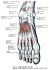 短趾伸筋;短指伸筋(足の)【たんししんきん(あしの)】 o: Dorsal aspect of calcaneus. i: Dorsal aponeuroses of second through fourth toes. I: Deep fibular nerve.(短趾伸筋は踵骨の上端および下伸筋の支帯より起こり第2~4趾、ときには第2~5趾(約8%)の背側腱膜へ至る。この筋の4本の腱はいずれも前内側に進むが、そのうち最内側のもの(ときに短母指伸筋腱extensor hallucis brevis tendonともよばれる)は第1趾の基節底に停止する残りの3本の腱はそれぞれ第2,第3、第4趾に向かう長指伸筋腱への合流を示す。短趾伸筋は深腓骨神経の支配を受ける。この筋は第1~4趾を伸展させる。この筋の作用は距腿関節で足が背屈して長指伸筋が動けない状態下で特に顕著となる。)