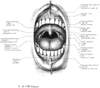 口蓋扁桃【こうがいへんとう】 Tonsil located between the palatoglossal and palatopharyngeal arches.(口蓋扁桃は舌口蓋弓と咽頭口蓋弓の間にある。扁桃中もっとも大きく、よく発達した扁桃である。肉眼解剖学的には、アーモンドの種の形に似ていて、組織学的には重層扁平上皮がおおっているが、この上皮が深く落ち込んでいて、十数個の陰窩cryptsを形成している。これらの陰窩に沿って、上皮の下層の固有層にリンパ小節が並んでいる。扁桃窩は発生上は第2鰓嚢のなごりとみなされる。扁桃窩の前方部には、三角ヒダが口蓋舌弓から張り出し、上方では口蓋舌弓と口蓋咽頭弓を半月ヒダが結ぶ。扁桃窩の上部に残された口蓋扁桃に占有されない扁桃窩の部分を扁桃上窩という。口蓋扁桃の表面に認められる小小陥凹が扁桃小窩で、これは扁桃の上皮が陥入してつくる扁桃陰窩の上皮表面への開口部を示す。 )