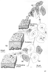 腟【ちつ】 Fibromuscular canal about 10 cm long that is flattened frontally and appears H-shaped in cross-section.(腟は女性の交接器であり、産道の下部をなし、月経による産物を排出する経路となる。上方は子宮口を通じて子宮腔に、下方は腔口を通じて腟前庭で外界に開く。腟口を不完全に閉じる粘膜のヒダが処女膜で、その遺物が残るものを処女膜痕という。子宮の腟部が腟後壁の方を向くため、後壁は長く(7cm以上)、前腟はやや短い(6cm)。子宮腟部と腟壁の間で、腟部を輪状に取りまく陥凹を腟円蓋という。腟壁には横皺が多く、腟粘膜皺といい、前・後壁には縦の隆起があって、前皺柱、後皺柱という。前皺柱の下部は尿道により生ずる腟の尿道隆起に連続する。粘膜上皮は重層扁平上皮、筋層は平滑筋からなる。腟の刺激によって、性感特に絶頂反応(オルガスム)が起こるメカニズムについたは、ほとんど何もわかていなかった。産婦人科医の話によると、腟口の一部分を除けば、腟は機械的な刺激には鈍感らしい。メスで切っても鉗子でつまんでも、患者は痛みを訴えないという。組織学的にも、腟壁に豊富な知覚神経が分布している様子はなく、終末装置のようなものは全く見られない。それでは性交による腟の快感はどこからくるのだろうか?最近の研究によると、その答えは、腟の前方を走る尿道にありそうだ。免疫組織化学の発達によって、尿道の固有層と更に上皮の中に、知覚神経(Substance PとCGPRという、いずれも知覚神経に特徴的な伝達物質を含む)が、想像を絶するほど密な網を作っていることが分かってきた。それに加えて上皮の中には、セロトニン(5HT)というアミンを分泌する、神経細胞に似た正常の細胞(paraneuron)がたくさんに分布している。このパラニューロンは、上皮の中に樹枝状に突起を伸ばし、その分布と形態から見て、圧迫される、引き延ばされる、といった機械的な刺激を受ける機械受容細胞mechano-receptorと推定される。)