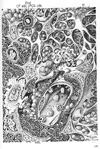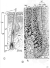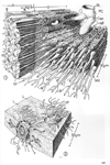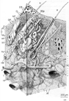 毛細管;毛細血管【もうさいけっかん;もうさいかん】 (毛細血管は、細動脈と細静脈の間にあって、多くの分枝、吻合を繰り返し、組織中を網目状に走行する、非常に細い血管である。その直径は8~10μmで、赤血球より幾分大きい程度である。毛細血管壁は内腔をつつむ1~3個の内皮細胞と、その外側にまばらに分布する周皮細胞とから構成されている。細動脈から毛細血管への移行は、中膜における平滑筋細胞の有無により、はっきりと区別されるが、毛細血管から細静脈への移行は徐々に生じ、両者を明確に区別することは困難である。多くの分枝吻合により、毛細血管網における血管表面積は、非常な増大を示す。表面積の増大とともに、血流に対する抵抗も大となり、血液はこの部位を、非常にゆっくり流れることになる。大動脈では血液は、平均320mm/sで流れるのに対し、毛細血管ではその約1/1000程度の速さでしかない。血液はゆっくりと流れながら、増大した血管内腔面に十分ふれ、薄い血管壁を介して、十分な物質交換を行うことになる。毛細血管壁の構造は、光顕による観察から、すべて同じと考えられていたが、電顕的には、主として内皮細胞の違いから、さらに3つに分けられることがわかった。それらは、連続型毛細血管、有窓型毛細血管、洞様毛細血管である。①連続型毛細血管continuous capillaryは最も普通にみられる毛細血管である。筋肉や結合組織、脳など、体の多くの部位に分布する。内皮細胞の核は核の部位でのみ厚く、その周囲は、連続した薄い細胞質よりなる。その厚さは通常0.1~0.2μm程度である。細胞質には細胞膜の陥入や、これらが中へ落ち込んで生じたと思われ60~70nm径の小胞がほとんどみられないものもある。血管壁の浸透性と関係があるようである。細胞と細胞の連結部では、細胞膜は一定の間隙を隔てて、まっすぐに、あるいはジグザグにかみ合っている。内腔側には閉鎖結合もみられる。またこの連結部には、内腔に向かって突出する、内皮細胞のヒダが時に観察される。これは辺縁ヒダmarginal foldとよばれるが、その機能については明確でない。基底膜は、内皮細胞の外側を完全におおっている。②有窓型毛細血管fenestrated capillaryは、内皮細胞の核部以外の、周囲に伸びる細胞質は連続型のものよりもっと薄く、かつ、その部位に、直径60~80nm程度の多くの孔が存在する。時にはもっと大きな径を示すものもある。腎臓、内分泌腺、超粘膜など、物質透過の盛んな部位に多く見られる。腎糸球体における毛細血管では、孔は、血管腔側と基底側の間を完全に通過するが、普通は、孔の途中に非常に薄い1層の隔膜が横切り、孔を閉ざしている。この隔膜の性質および機能については明らかでない。物質透過の際のフィルターの役割を果たしているのかも知れない。孔は、一定間隔に規則正しく配列するが、内皮細胞全体に一様に分布するのではなく、幾分細胞質の厚い、全く孔の存在しない部位が帯状に伸び、細胞表面を幾つかに区切っている。孔の分布の状態、数は組織により多様である。内皮細胞の外側にある基底膜は、連続型の場合と同様、孔に関係なく全体をつつむ。③洞様毛細血管は類洞ともよばれ、内皮細胞は器官を作る実質細胞に沿うようにして並び、したがって、その横断像は必ずしもまるくなく、不規則な形を示す。太さは多様であるが、他の型の毛細血管に比べ、かなり広い管腔をもち、その中を血液は、ゆっくりと流れることができる。内皮細胞には、その細胞質を貫通する、かなり大きな孔を有するものや、かなり開いた細胞間隙を示すものがあって、それらの部位を、巨大な物質も容易に通過することができる。基底膜はあまり発達せず、不連続な物やあるいは全く欠くもものもある。洞様毛細血管は、肝臓、脾臓、骨髄などでしられるが、内皮細胞は、各組織に固有の形態を示す。④毛細血管の透過性と構造との関係は毛細血管およびこれにつづく細静脈は、血管壁を通して、血液と組織の間で物質交換を行う部位である。心臓から毛細血管に至るまでの動脈、そして心臓へと戻る静脈は、いわば血液の通路であり、毛細血管網および細静脈の領域において初めて、血液循環の本質的な機能が含まれることになる。毛細血管では、内腔表面積は非常に増大し、総表面積が6,000m2、横断面績の総和は、大動脈のほぼ800倍にも相当するという。血液はこの広い内宮面にふれながら、うすい内皮細胞と、基底膜を通して、物質の交換を行うことになる。水や電解質など低分子物質は、これらの部位を静水圧や浸透圧、濃度勾配の差によって、自由に通過しうるが、これだけでは、組織を維持するのに十分とはいえない。蛋白質のような高分子物質は、直接膜を通過することはできず、これらが膜を通過するためには、特殊な機構が必要である。)