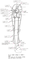 Willis, Circle of大脳動脈輪【だいのうどうみゃくりん】 Arterial circle on the base of the brain. It connects the carotid and vertebral artery systems and often ensures equilateral blood supply. It mainly supplies the diencephalon via the communicating arteries.(ウィリスの動脈輪ともよばれる。大脳動脈輪は脳底部において、内頸動脈と椎骨動脈の枝が連絡して形成された輪状ないし六角形の動脈吻合である。構成にあずかる動脈は、内頚動脈側では前大脳動脈、左右の前大脳動脈を連絡する前交通動脈、中大脳動脈、椎骨動脈側では後大脳動脈、そして中大脳動脈と後大脳動脈を連絡する後交通動脈であり、それらが視神経交叉、下垂体漏斗部、乳頭体、後有孔質などを取り囲む動脈輪を形成する。大脳動脈はすべてこの動脈輪を介して出るということができる。大脳動脈輪は、脳のいろいろな場所へ血液を均等に分配すると言われているが、正常では血圧が等しいので大脳動脈輪の左側と右側との間で血液の交換はほとんど行われない。大脳動脈輪と主要な大脳動脈から2種類の枝、すなわち中心枝と皮質枝が出る。中心枝は、大脳動脈輪と主要な大脳動脈の近位部からでて脳の実質内に入り込み、脳の深部の組織に血液を供給する。前脈絡総動脈と後脈絡叢動脈は、それぞれ内頚動脈の枝と後大脳動脈の枝として出るが、ともにこの中心枝のグループにいれられている。脳内に侵入した血管、とくに中心枝は、他の動脈と吻合しないといわれていて、終動脈とよばれる。人脳では終動脈は存在しないが、大きい血管に突然閉塞が起こると、これらの小動脈の吻合だけでは必要な血液供給を十分に維持することができない。一方皮質枝は、それぞれの主要な大脳動脈から分岐して、軟膜内を通り大脳皮質の広い領域に多数の枝をだしながら、脳表面で自由に吻合して動脈叢を形成する。この動脈叢より分視した小さな動脈は、大脳表面から皮質内にほとんど直角に入り込み、いろいろな深さに達する。動脈輪の各部の発達には個人差が著しく、完全な輪が形成されないことがある。英国の医学者Thomas Willis (1621-1675)により、1664年に発表された。)