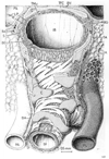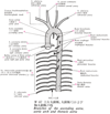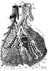 気管支動脈;気管支枝(胸大動脈の)【きかんしどうみゃく;きかんしし(きょうだいどうみゃくの)】 Their origin is highly variable, often at the level of the tracheal bifurcation. They ramify along the bronchi, extend to the bronchioles and supply their walls and the connective-tissue septa of the lungs. They form anastomoses with branches of the pulmonary artery.(気管支動脈は2~3本で、大胸動脈や付近の動脈から起こり、肺門から肺に入る。気管支およびその分枝に沿って走り、呼吸細気管支にいたるまでの気道、小葉間結合組織、臓側胸膜に分布する。)