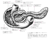 上腸間膜動脈【じょうちょうかんまくどうみゃく】 Second unpaired aortic branch. It arises about 1 cm below the celiac trunk at the level of the first lumbar vertebra. It initially runs behind the pancreas, then on the uncinate process and gives off branches to the mesentery and mesocolon. It supplies the head of pancreas, the small intestine as far as the superior part of duodenum, and the colon up to the splenic flexure.(上腸間膜動脈は腹腔動脈の約1~2cm下方(第1腰椎の高さ)で、腹大動脈の前側から起こる。動脈ははじめ膵臓の後ろを走り、膵臓の頭の左側に沿って前方に出て、十二指腸水平部の前面を下行し、小腸間膜のなかに入る。小腸間膜内で、左方にやや凸のカーブを描いて右腸骨窩に向かって下行し、下膵十二指腸動脈、空腸動脈、腸骨動脈、回結腸動脈、虫垂動脈、右結腸動脈、中結腸動脈に分布する。上膵十二指腸動脈、左結腸動脈と吻合する。)