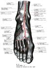 前外果動脈;前外踝動脈;前腓側踝動脈【ぜんがいかどうみゃく;ぜんがいかどうみゃく;ぜんひそくかどうみゃく】 Artery passing beneath the tendon of the extensor digitorum longus to the lateral malleolar network.(前外果動脈は距腿関節の少し上方で本幹より分かれ、長趾伸筋の下を下方へ走り、外果動脈網へ。途中、腓骨動脈の貫通枝と腓骨か端部の前面で吻合する。この吻合枝はきわめて細いが、ときに発達して前脛骨動脈の弱小を補い、脛骨動脈から足背動脈へと接続することがある(約7%)。)