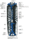副半奇静脈【ふくはんきじょうみゃく】 It receives the fourth through eighth intercostal veins and opens alone or together with the hemi-azygos vein into the azygos vein. It can also receive the first three intercostal veins and, in this case, anastomose with the left brachiocephalic vein.(副半奇静脈は左側で上位6ないし8肋間の静脈血を集めながら、脊柱の左側下行し、第8胸椎の高さで脊柱の前面を横切って奇静脈にそそぐか、あるいはそのまま半奇静脈にそそぐ。発生学的には、左上肋間静脈とともに左後主静脈と主上静脈の上半部に由来する。)
