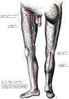 大伏在静脈【だいふくざいじょうみゃく】 Vein possessing valves that arises on the medial side of the foot and ascends medially, collecting most of the medial superficial cutaneous veins. It passes through the saphenous opening to empty into the femoral vein.(大伏在静脈は古くは薔薇静脈とよんだこともある。ギリシャ語のsaphisは「見える」という意味であるというが、他方アラビア語では「かくれた」という意味を表すという。このように語原的にはギリシャ語とアラビア語では反対の意味に解されているのは興味深いが、いずれにしてもVena saphenaの語原ははっきりしていない。大伏在静脈は下肢最大の皮静脈で、下肢の内側に沿って皮下組織の中を上行する。足背の内側縁にはじまり、内果の前を通るが、この部分で皮膚のうえからその走行をみることができる。伏在神経と伴行して下腿の内側を通り、膝関節の後内側を経て大腿内側面を上行し、鼡径靱帯の下方で深く入り、伏在裂孔で大腿静脈にそそぐ。この経過の途中、周辺より多くの皮静脈がこれに合流するが、とくに大腿の内側と後面よりの皮静脈は1本に合して伏在裂孔のやや下方で大伏在静脈にそそぐことがある。これを副伏在静脈という。また大腿の前面や外側面よりの皮静脈が合しこれにそそぐときは、とくに外側伏在静脈とよぶことがある。このときは大内々側面よりのものは内側伏在静脈という。)