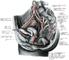 内腸骨リンパ節【ないちょこつりんぱせつ】 Lymph nodes located along the internal iliac artery that drain the pelvic organs, deep perineal region, and outer and inner pelvic wall. Drain into: common iliac nodes.(内腸骨動脈周囲に位置するリンパ節群。骨盤臓器(膀胱・前立腺・直腸・精嚢・子宮頚など)に加え、骨盤底では直腸下部や膣からのリンパが流入する。ここからのリンパは総腸骨リンパ節に向かう。(イラスト解剖学))