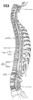 脊髄【せきずい】 It extends from the end of the medulla oblongata near the exit of the first spinal nerve to the beginning of the terminal filum at L1 or L2.(脊髄は頚部(頚髄)、胸部(胸髄)、腰部(腰髄)、仙骨部または脊髄円錐(仙髄と尾髄)とからなり、それぞれ髄節に分かれ、それに対応して31対の脊髄神経が出る。頚髄では8対の頚神経、胸髄では12対の胸神経、腰仙髄では各々5対の腰神経と仙骨神経とが出る。尾髄からは通常1対の尾骨神経が出る。上肢および下肢支配の神経の出る頚髄下部と腰髄下部は発達が著しく、太くなっており、それぞれ頸膨大、腰部大とよばれる。脊髄下端は細くなり脊髄円錐となっておわる。その高さは成人では第1ないし第2腰椎の高さに相当する。新生児、幼児では低く第3腰椎の高さでおわっている。脊髄円錐の先はさらに細く糸状の終糸となって尾骨の背面に付着している。終糸に沿って走る脊髄神経の束はその形状から馬尾とよばれている。脊髄外側面でその腹側と背側の正中には(前)正中裂および(後)正中溝とよばれる溝があり、脊髄を左右の半分に分けている。前者は後者より深く、そこには前脊髄動脈が走っている。左右の脊髄半の外側面には腹側の前外側溝と背側の後外側溝の二つの溝がある。頚髄の高さの背側面は中心部の灰白質とその周辺の白質から成る。灰白質はそれぞれ前角(柱)、中間質(帯)、後角(柱)がある。灰白質の中央を貫いて中心管が通る。上方は第四脳室に開き、下方は脊髄炎水の所では拡大して終室となる。白質は前外側溝と後外側行と②より腹側の前索と外側の側索および背側の後索の3部分に分けられる。頚髄の高さで後索は後中間溝により内・外の薄束と楔状束とに分けられる。)