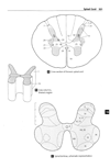 脊髄第VII層;脊髄の中間帯【せきずいだい7そう;せきずいのちゅうかんたい】 Lamina surrounding the greater portion of the intermediate column.(第Ⅶ層はまた、中間帯としても知られているが、前角と後角の中間に位置する。この層の境界は脊髄レベルにより変化しており、脊髄の膨大部では腹側方へ広がって前角の中まで入っている。しかしその他のレベルでは、脊髄灰白質を横切る比較的狭い帯状の領域を成し、ここに側角が含まれる。第Ⅶ層には、いくつかの大きな細胞集団が多数の介在ニューロンとともに含まれている。中間質外側核と呼ばれる細胞集団は第1胸髄から第2腰髄までの高さにおける脊髄灰白質の側角をなすものであるが、この細胞集団は交感系節前ニューロン細胞体の第Ⅶ層での集まりにほかならない。中間質内側核という名の細胞集団は脊髄の全長にわたって第Ⅶ層存在するものであり、第Ⅶ層の内側部、中心管の外側部にある小形細胞柱で、あらゆる脊髄レベルで臓性求心性線維群を受ける。胸髄核(クラーク背側核とも呼ばれるもの、この核の神経細胞は多極性ないし卵形で、粗大なニッスル小体と、特徴的な偏心性の核を持っている。後根求心性線維の側枝が、この核の神経細胞に強固にシナプするを形成しており、それは多数の脊髄レベルにおいて著明に互いに重なりあっている)は第1胸髄から第3腰髄までの第Ⅶ層にあり、筋紡錘や腱器官などからの固有感覚入力を受ける。胸髄核から発する軸索は同側上行性の後脊髄小脳路を形成する。また、第2~4仙髄での第Ⅶ層には、仙髄副交感核sacral autonomic nuclei(副交感系の節前ニューロン細胞体の集まり)があるがここではもはや側角を認めない仙髄副交感核は副交感神経性節前線維を出しており、その線維は仙髄前根から出て「骨盤神経」をつくる。胸髄並びに上部腰髄の中間質外側核、仙髄副交感核の細胞群はコリン作働性であって、コリン・アセチルコリントランスフェラーゼに対する抗体により免疫染色される。第Ⅶ層と、これに接する第Ⅴ層、第Ⅵ層の部分にある神経細胞は、明瞭な神経核を形成してはいないが、前脊髄小脳路anterior spinocerebellar tractをつくる交叉性の線維を出す。中心頚核central cervical nucleusは、上位4つの頚髄中にある継続的な神経細胞中であって、延髄下部にまでのびている。この核の比較的大きな多極性の神経細胞は、中間質内側核の外側にみとめられる。中心頚核の神経細胞には後根神経線維が到達しており、かつ、交叉性に小脳への投射線維をだしている。)