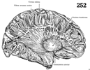 レンズ核【れんずかく】 Nucleus arising from the telencephalon and diencephalon.(レンズ核は小細胞性の被殻と大細胞性の淡蒼球を合わせたもので、その形が全体として両凸レンズに似ており、その全外面を神経線維群で包まれているため、一括してレンズ核とよばれる。尾状核頭および視床の腹外側にある大きい核で、前頭断でも水平断でも三角形で、頂点は内側に、底辺は外側にある。レンズ核は薄い外側髄板によって内側の淡蒼球と外側の被殻に分かたれる。レンズ核の内面は内包によって囲まれ、外面は外包によっておおわれる。しかし、両者の発生・細胞構築・線維連絡などは互いに異なる。被殻はレンズ核の外側面の近くにあって多少赤茶色を帯び、淡蒼球はレンズ核の内側面よりを占めて色も白っぽい。発生学的には、淡蒼球が最も古く、古線条体paleostriatumとも呼ばれる。これに対して尾状核と被殻は新しいので、この両者を合わせて新線条体neostriatum(または狭義の線条体striatum)という。また古線条体と新線条体をあわせたものすなわちレンズ核(淡蒼球+被殻)と尾状核を総称して、広義の線条体corpus striatumと呼ぶ(線状体ではない)。また広義の線条体にに扁桃体と前障を加えたものが大脳基底核basal gangliaである。大脳基底核の障害としては、パーキンソン病が有名である。)