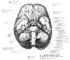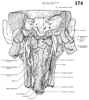 迷走神経[脳神経X]【めいそうしんけい[のうしんけい10]】 Nerve arising from the fourth and fifth pharyngeal arches. It emerges from the medulla oblongata together with CN IX in the posterolateral sulcus and passes through the jugular foramen. Its distribution area extends into the thoracic and abdominal cavities.(迷走神経は第10脳神経で、上方の舌咽神経、下方の副神経の間で延髄の外側から多数の小根によって起こる混合神経で胸腹部の諸内臓に分布する副交感神経節前神経線維(延髄迷走神経背側核に細胞体をもつニューロンの神経突起)を主成分としている。これらの線維が胸腹部を走行するあいだに、きわめてしばしば自律神経叢を形成してどこに神経の本幹が存在するか不明瞭となるため、迷走神経の名がつけられた。また迷走神経には胸腹部の内臓の知覚を伝える神経線維(その細胞体は迷走神経の下神経節内に存在する)、咽頭下部および後頭の筋への運動線維(延髄疑核に発し、咽頭に分布するものは舌咽神経からの枝とともに咽頭壁において咽頭神経叢を形成したのち筋に分布する)、咽頭下部および後頭の粘膜への知覚神経線維、などが含まれる。後頭に分布する運動および知覚神経線維は下神経節の直下で後頭に向かう上喉頭神経となるか、あるいは胸腔内で迷走神経本幹から下喉頭神経として分かれて頚部を反回神経として上行するかして目的の器官に達する。)